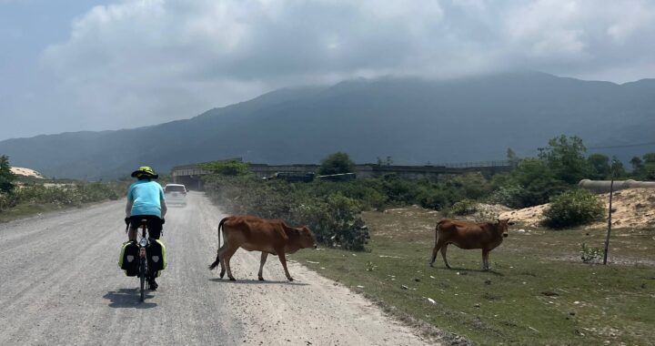 Nhà Trang—We’ve reached what will become our three-day “beach vacation” where bikes stop rolling. There have been far fewer tourists than expected in Vietnam outside of Hồi An and Phòng Nhà and Danang. Yet, we continue to see mega-building projects underway in what could be perceived as a developer’s utopian dream, or hopeful optimism about the future of tourism—or big money gone horribly wrong. Having become accustomed to half-full (or near empty) hotels we don’t know how to feel when we see dual 35-storey buildings partially built and not a soul in sight—tourist, worker, or otherwise. No matter—this is a busy city with lots of cultural vibrancy to take in. We will just bob up & down in the waves while we contemplate it all.
