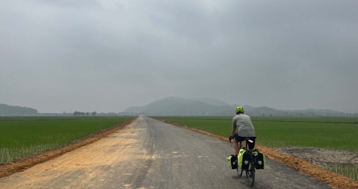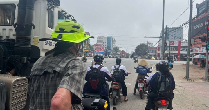 Later, when the sun came out and the day really started heating up we took our chances on a dubious little road through a village just to escape some gnarly traffic mayhem. It was all lalalalala…until it wasn’t. “Woof woof wooof arff arfff wooof what-the-heck!” — Just keep goin! Look ahead! Don’t stop! OMG! Randy dismounted to stare the dog down but it was a war of wills. Randy won that battle. Not five minutes later the scene played out again. Then again. By that time we were unnerved and stood there paralyzed, mentally calculating how to escape this village of crazy dogs and return to the preferable highway mayhem again. As we stood there, wishing we could teleport ourselves away, out of the corner of my eye I spotted an older Vietnamese man standing in his doorway trying to snap some incognito shots of the crazy first-time-for-everything-foreigners-in-the-village.