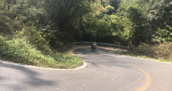 We pushed those bikes. Hard. Darn near killed us. Heart rates pounding in the heat….often just 20ft at a time, sometimes 10. We’d have to stand still, squeezing those brakes hard just to prevent rolling backwards. It was hard to really enjoy the surrounding jungle-ish scenery which was actually quite spectacular. At one point we heard loud rustling in the dense brush and the only wildlife we can think of is wild boars, which are apparently plentiful here. Khun Tan National Park. Beautiful, but not recommended to cycle through it! Demoralizing. However….there were birds chirping all the way!