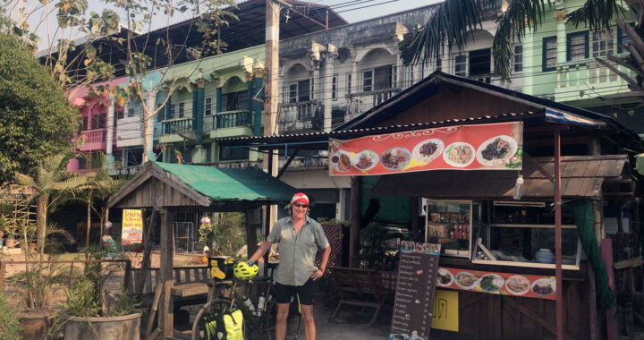 This morning our pump broke. Not a cheapy pump either. It is a good quality one that should do the job,but broke while topping up our tires this morning. The nearest place to buy a new one was 22km back the way we came yesterday. We took a gamble that today wont be the day we get a flat. Our destination was 82k away. We stopped just a few kms short of our final destination to locate a bike shop on Google Maps to but a new pump. With address in hand and just a few kms to go, we leave our roadside rest spot and wouldn’t you know it…a flat! Big bummer. No pump. We notice some people at a school across the street and decide to ask about where we can call a taxi. These wonderful Thai people all came to our rescue—a young teacher translated our situation to a nearby kind and generous man who offered to take the bicycle wheel himself on his motorcycle down the road to a place to get it filled with air. Everyone there was so kind and thoughtful as they all tried to help. Thank you, thank-you, to the wonderful teacher “who sometimes teaches English”, and thank-you to the 72 year old man who transported the bicycle wheel to and from the shop. You are all so lovely and kind!